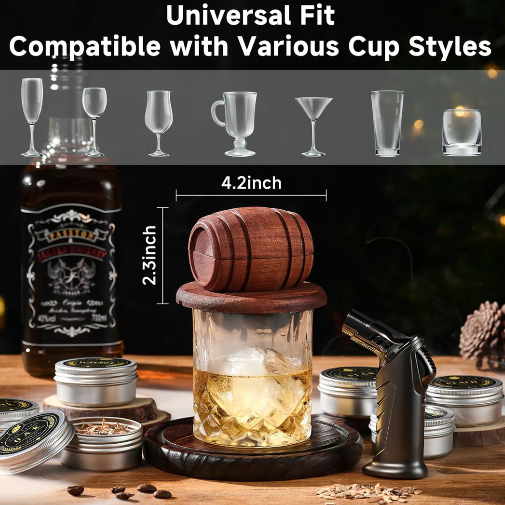 Complete Kit – Our premium Cocktail Smoker kit includes everything you need for a perfect smoking experience. From a high-end oak wood smoke top, a torch lighter without butane, six different natural wood chip flavors, ice molds, metal filter, two glasses, to a beautifully presented gift box, we give you the complete package to enhance your at-home bar and kitchen.